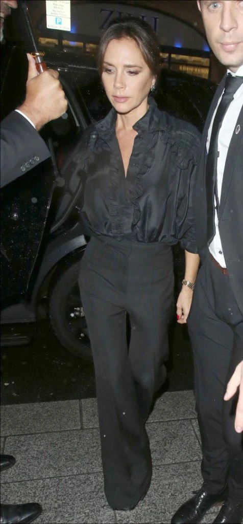 La diseñadora inglesa se lookeó con un total look black. Eligió una blusa con volados satinada, de inspiración flamenca (su costo supera los 1.300 dólares) y un pantalón de cintura alta y botamangas amplias de su nueva colección resort 2020. Y combinó el outfit con unos zapatos de taco.