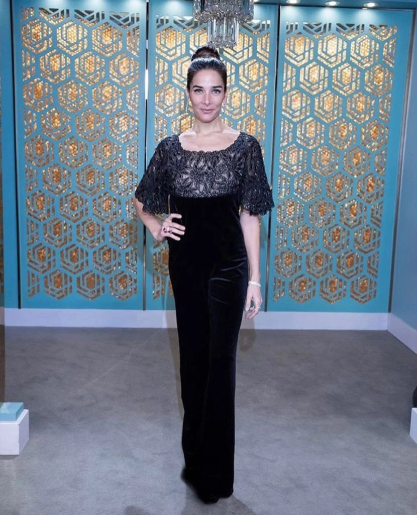 El sábado a la noche, la actriz deplegó toda su sensualidad con un pantalón de terciopelo de talle alto y top entero de organza bordada tipo Richelieu en azabaches de diferentes medidas, con un profundo escote en V en la espalda.
