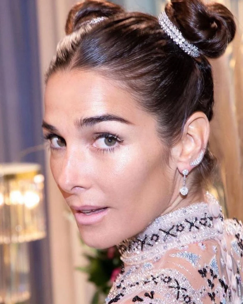 Acompañó el outfit con un peinado al estilo princesa Leia: dos rodetes prolijamente peinados con trenzas cosidas y tiritas de strass. "Le quise crear a Juana un look súper canchero y fresco con los dos rodetes y el doble delineado", aclaró Jorge Rey. Peinaron Infinito Studio Hair y Christian Stylist, y maquilló Mauricio Catarain.