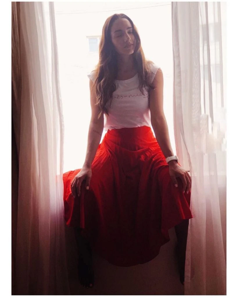 Las faldas plisadas (difíciles de llevar) parecen ser una de las prendas favoritas de Thelma. Compartió en redes un look con falda plisada roja y otro con pollera en color verde.