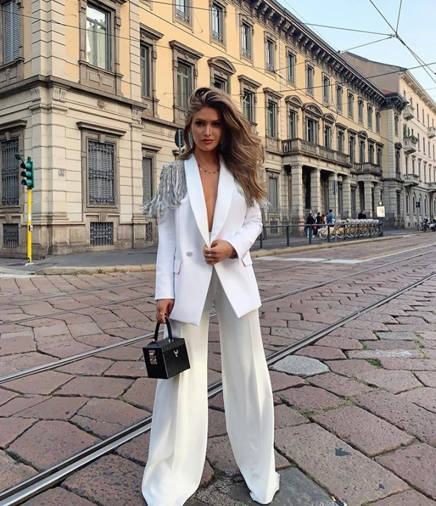 La chaqueta americana con cierre cruzado tenía un detalle de flecos plateados de strass que caían desde los hombros haciendo una especie de capa. La llevó con unos pantalones acampanados que le quedaban divinos.