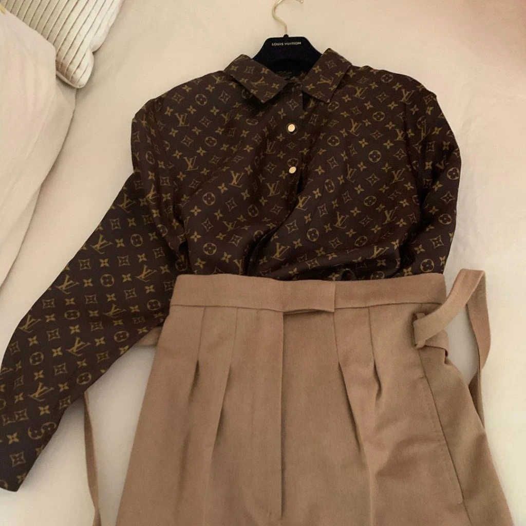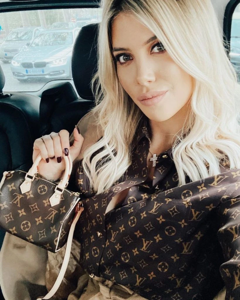 Wanda se vistió con camisa con el clásico holograma de la marca de lujo, pantalón pinzado tipo paper bag con lazo en la cintura y en color camel y tapado al tono. Le sumó una mini bag de Louis Vuitton.