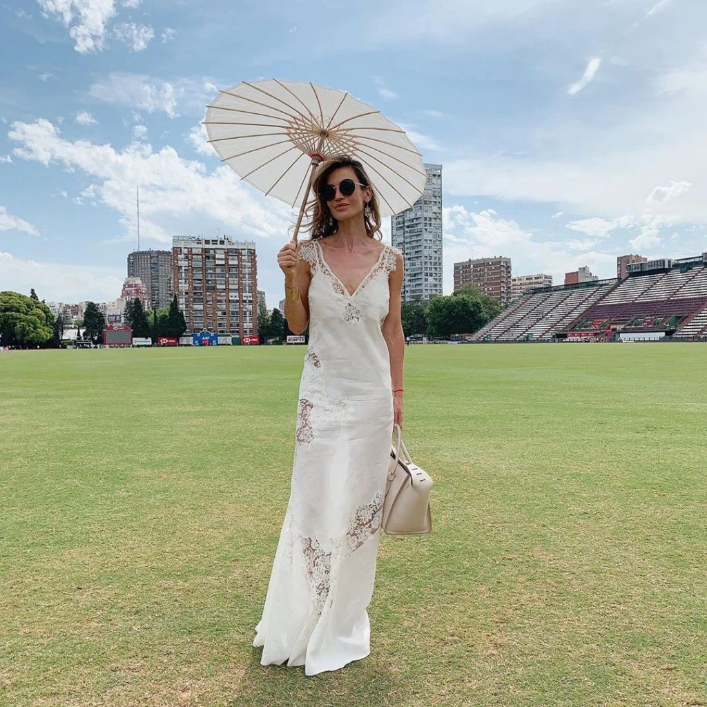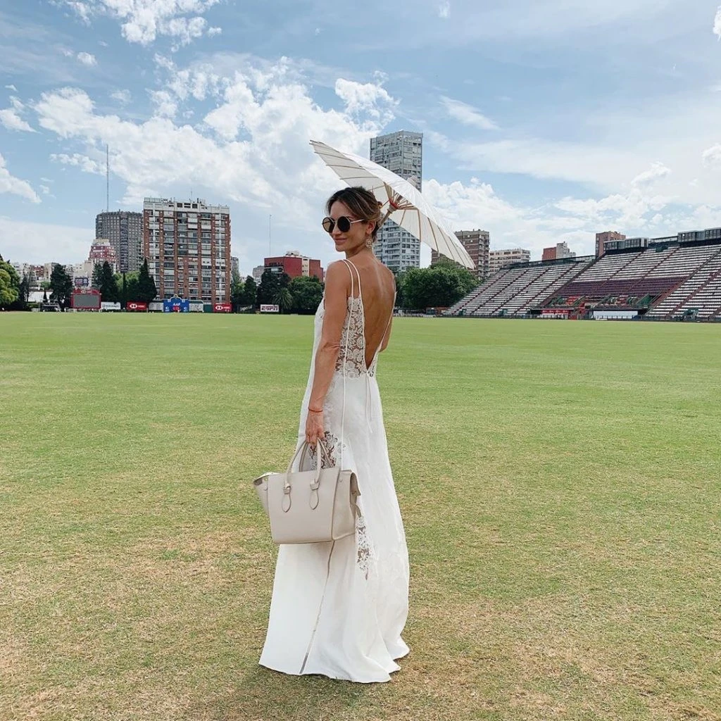 María Vazquez es una de las estrellas de estos campeonatos y siempre se destaca por sus looks. Como ama el color blanco, siempre lo elige para sus outfits. Y esta vez no fue la excepción: llevó un vestido tipo nupcial de El Camarín, la marca de su amiga la diseñadora Yanina Solnicki. Hoy los vestidos nupciales son tendencia en las red carpets.