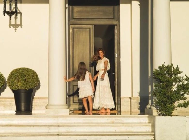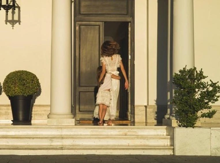 En la misma serie de fotos, después aparecen Juliana y su hija abrazadas y en la puerta de la residencia. Antonia lleva una blusa y una pollera con volados; Juliana un espectacular vestido de encaje con transparencias: parece una novia.