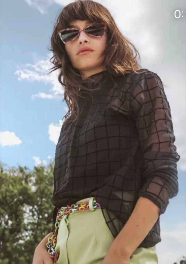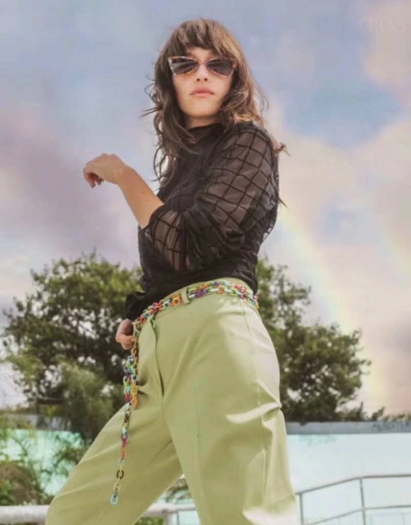 Con unas divertidas gafas, pantalón babucha color limón y una camisa, a cuadros, de gasa dió cátedra de moda con este look moderno y cancherísimo. Destacamos, especialmente, el cinturón de cadena de colores que le sumó glamour y mucha onda.