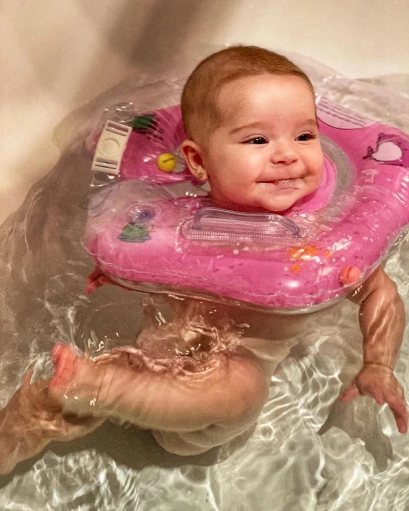 No hay nada más lindo que compartir el momento del baño con tu hijo cuando aún es bebé. Pero a veces puede resultar complicado. No sabés cómo tenerlo, se te resbala, y el bebé se pone nervioso. Sin embargo, Eugenia encontró la manera de disfrutarlo. Ella le coloca a Ema una especie de flotador que mantiene su cabeza fuera del agua mientras su cuerpo flota en la bañera.