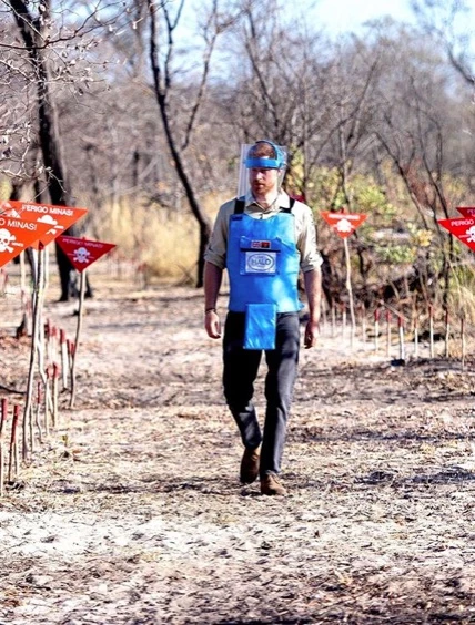 Un déja vù. Porque, tal como lo hizo su madre en 1997, el duque de Sussex recorrió un campo de minas antipersonales en África.