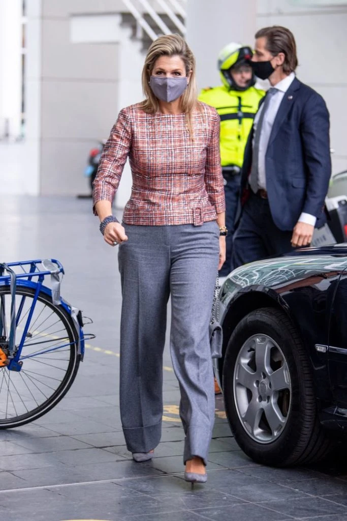 La reina de los paises Bajos durante el inicio del Año Nacional del Despliegue Voluntario 2021 en La Haya se la vió combinar el pantalón con una chaqueta de tweed en colores entallada al cuerpo y mangas 3/4.