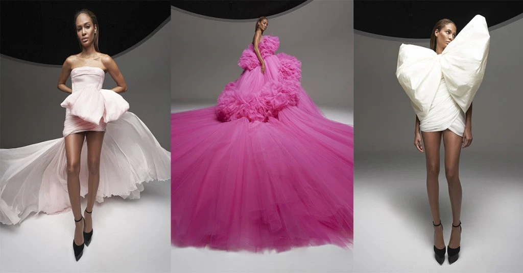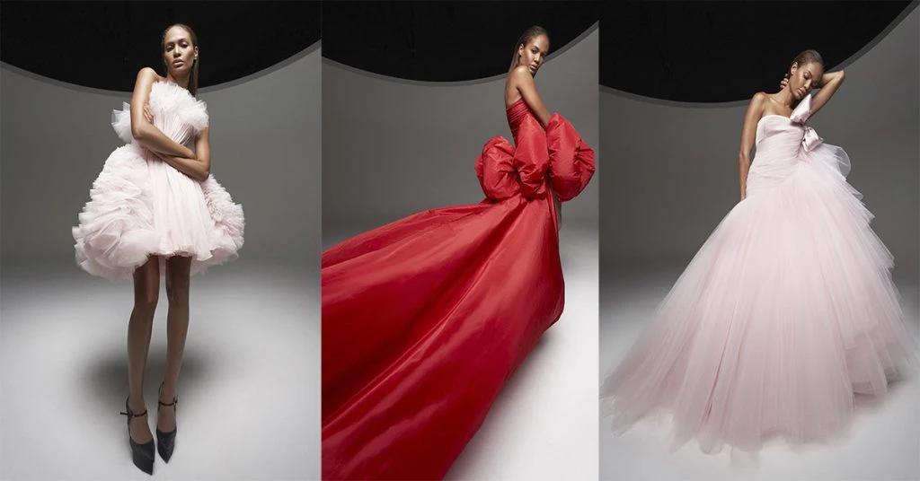 En esta colección predomina el ADN de la maison: tules drapeado, siluetas súper femeninas y faldas muy voluminosas.