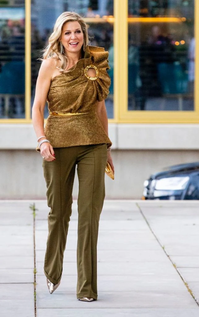 La reina de Holanda eligió un look súper sofisticado, que ya había usado: un top dorado de corte peplum diseñado por Claes Iversen, uno de sus diseñadoras favoritas, que deja al descubierto su hombro izquierdo y cubre el otro con una especie de volado sobre el detalle de un círculo.