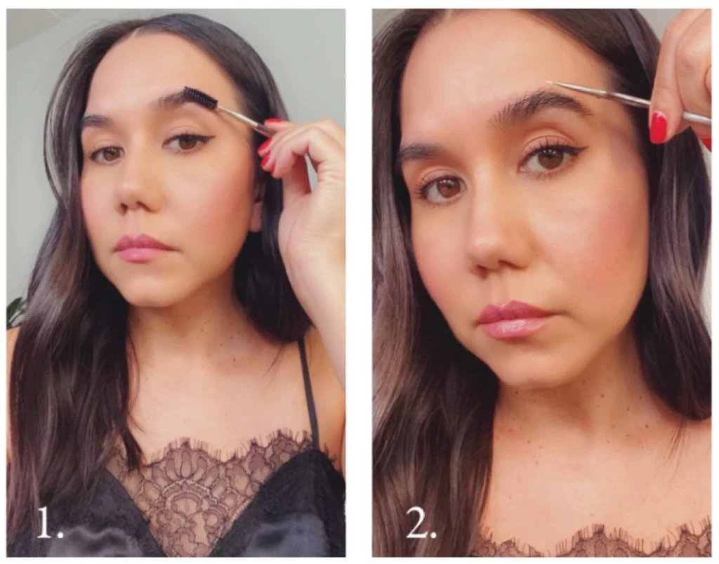 - Paso 2: Una vez que hayas cepillado las cejas, buscá los pelos que sobresalen de la forma natural de las cejas. RecortÁ esos pelos con cuidado.