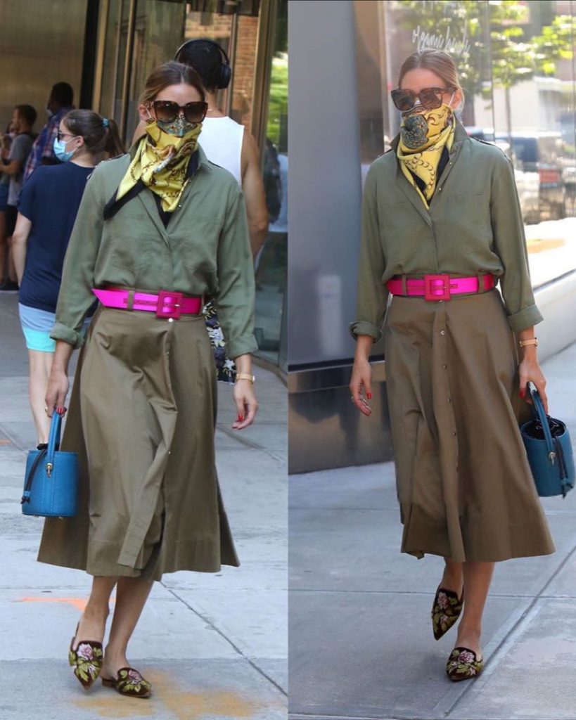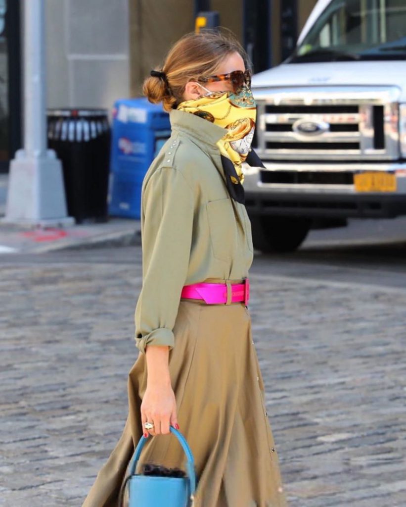 Su más reciente truco de estilismo es llevar pañuelos de seda ocultando el barbijo debajo de ellos. Fijate cómo se nota el elástico del barbijo que se asoma por debajo del pañuelo y llega hasta detrás de las orejas de Olivia.