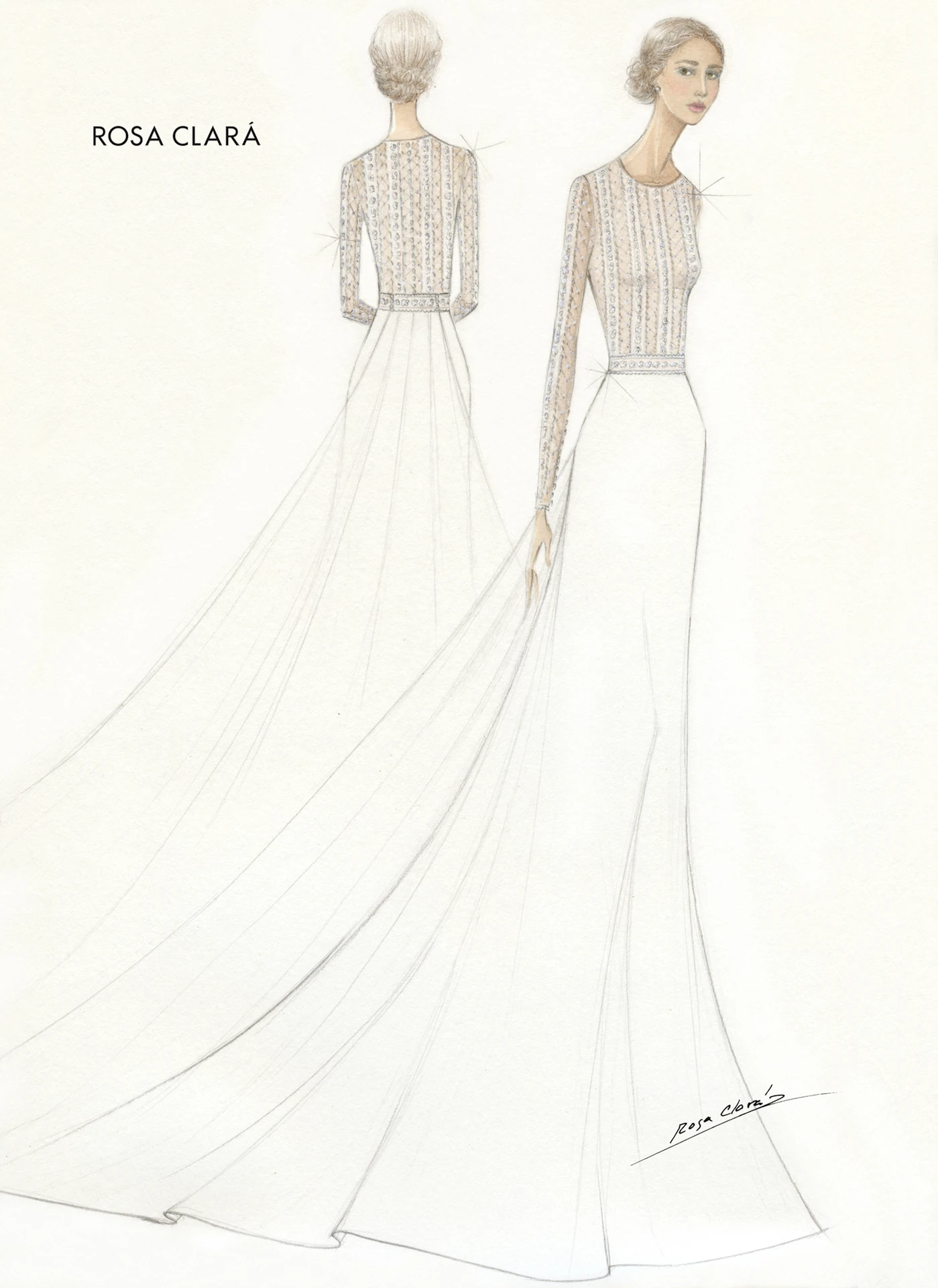El vestido es un elegante y sofisticado diseño de alta costura firmado por Rosa Clará de líneas puras y delicadas. El cuerpo, de escote caja y manga larga, está realizado en encaje francés, inspirado en el movimiento artístico Art Déco, compuesto por motivos gráficos y florales. Está bordado a mano, de manera meticulosa con micropedrería incrustada en el dibujo.
