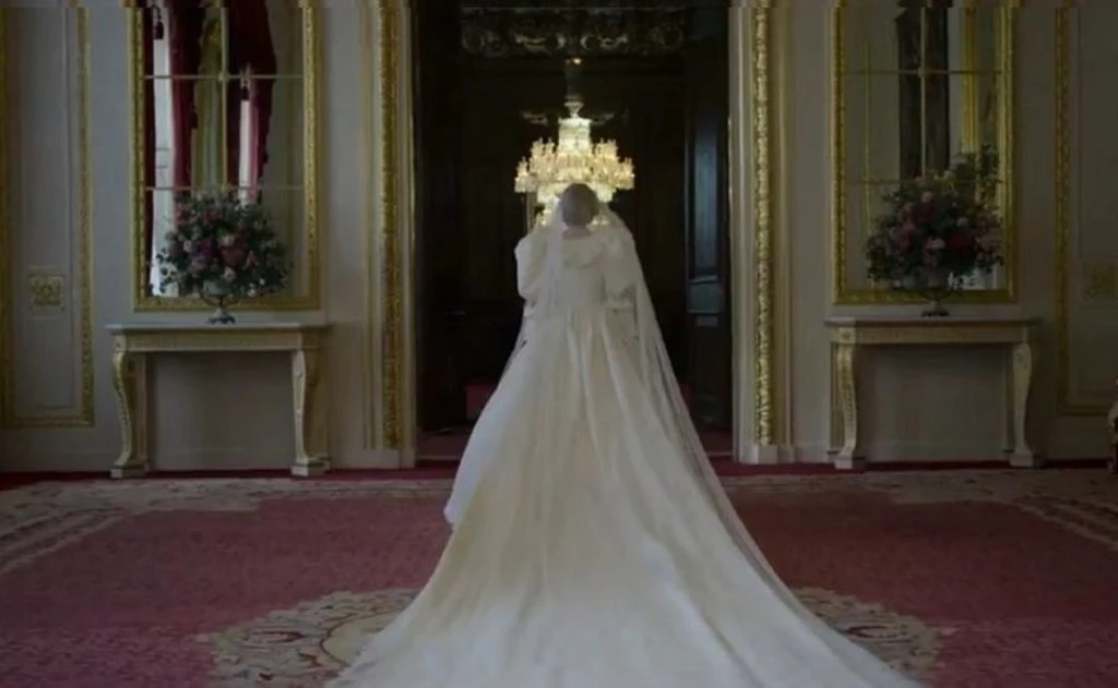 El vestido de novia de Lady Di se volvió a hacer de cero basándose en los bocetos y patrones que guardaron los diseñadores David y Elizabeth Emanuel, que hicieron el vestido original. La actriz, Emma Corrin necesitó luego la ayuda de 10 personas para ponérselo de tan aparatoso que era.