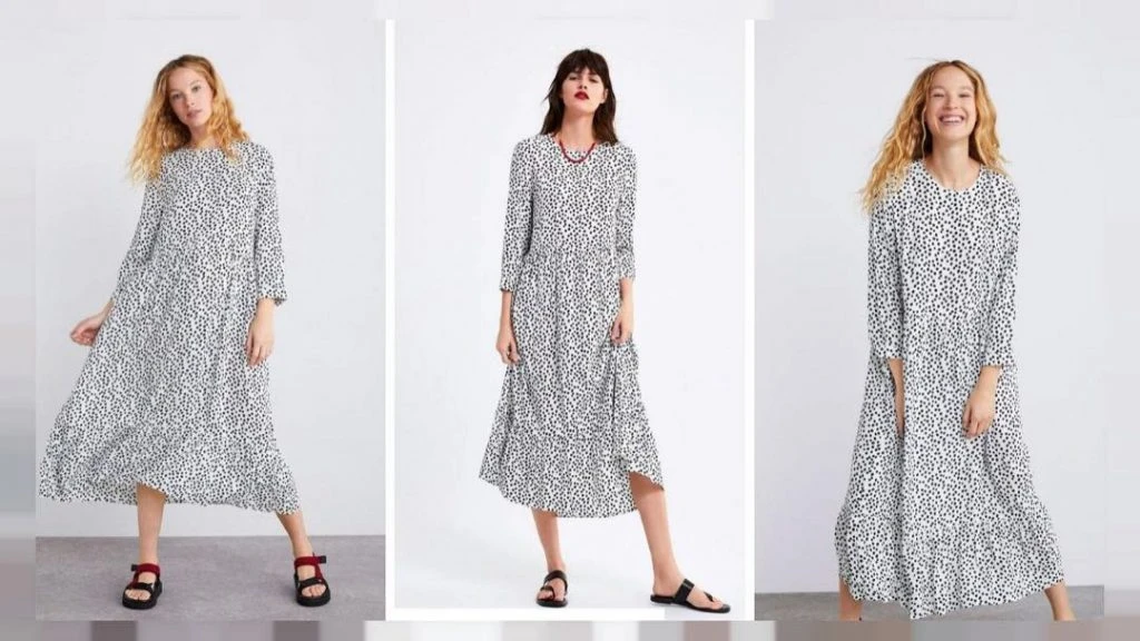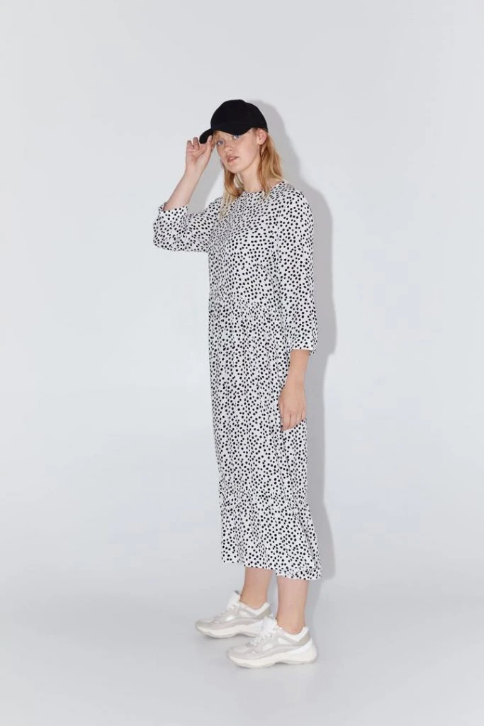 Este vestido midi suelto tiene cuello redondo, manga por debajo del codo, terminación con volado y cierre en espalda con abertura y botón. Zara lo vende también con los colores invertidos pero el vestido viral, en realidad, es el blanco con los lunares negros y sale $ 5.590 si lo querés comprar hoy online.