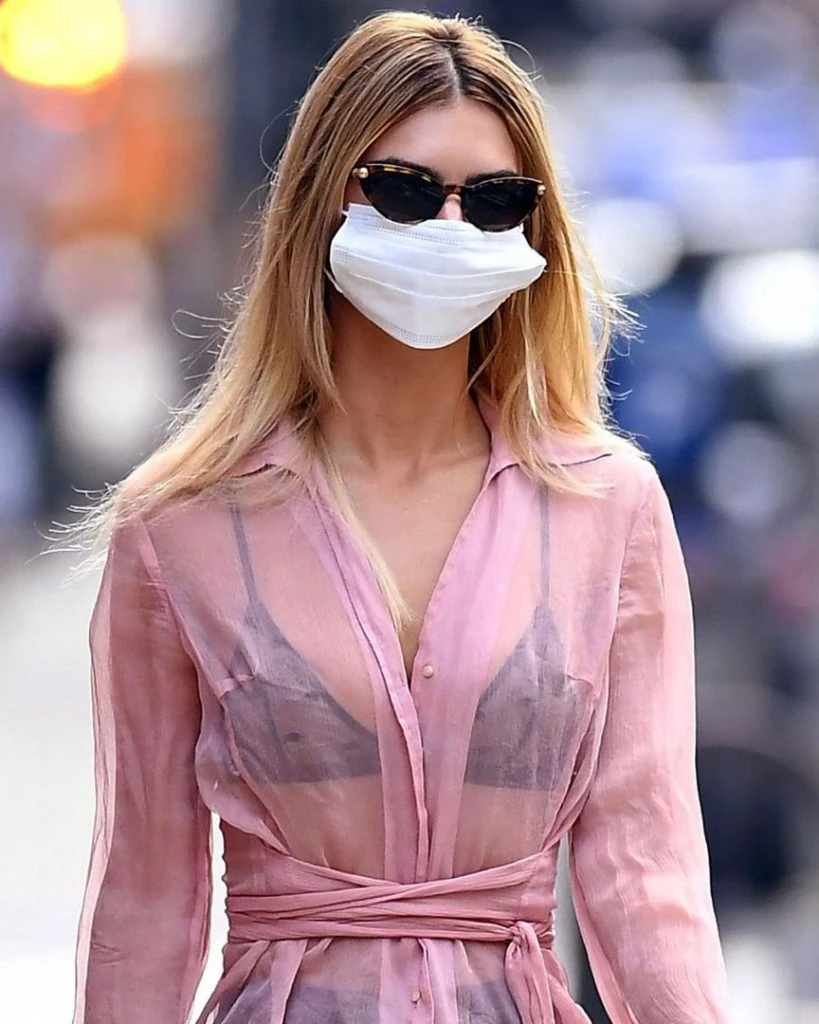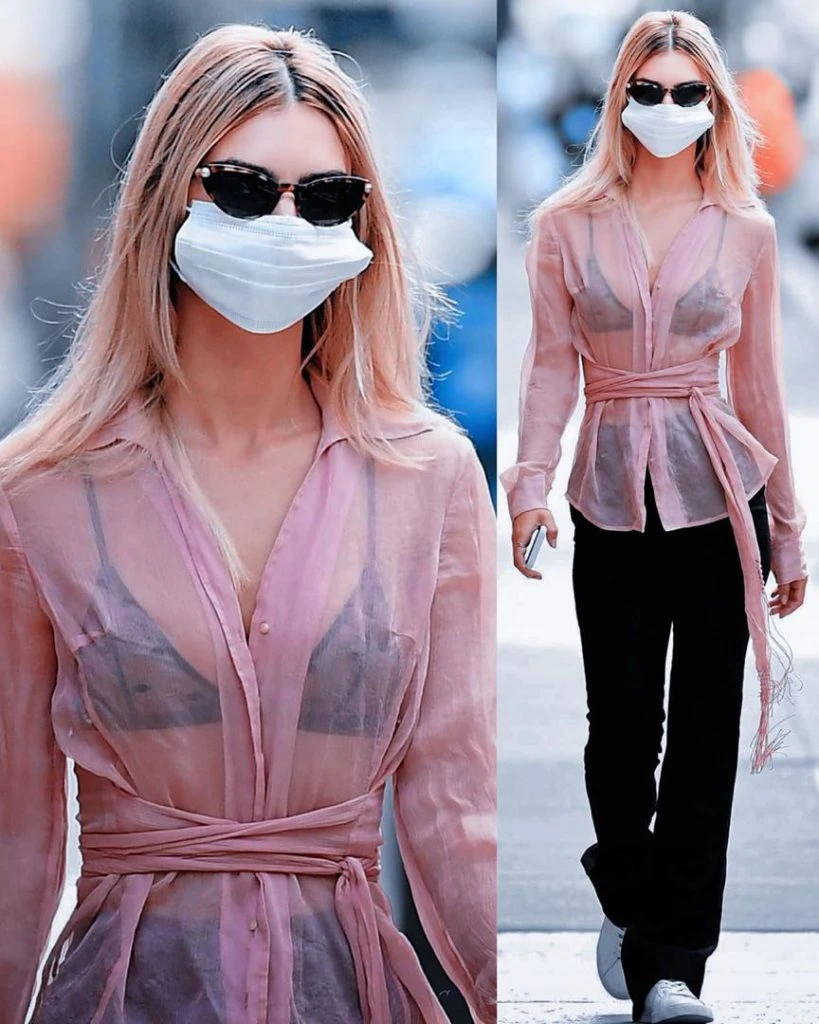 Otro día de la semana, Emrata llamó la atención con un total look transparente. Muy sugestivo. Salió a pasear con su marido, Sebastian Bear-McClard, y no pasó desapercibida.