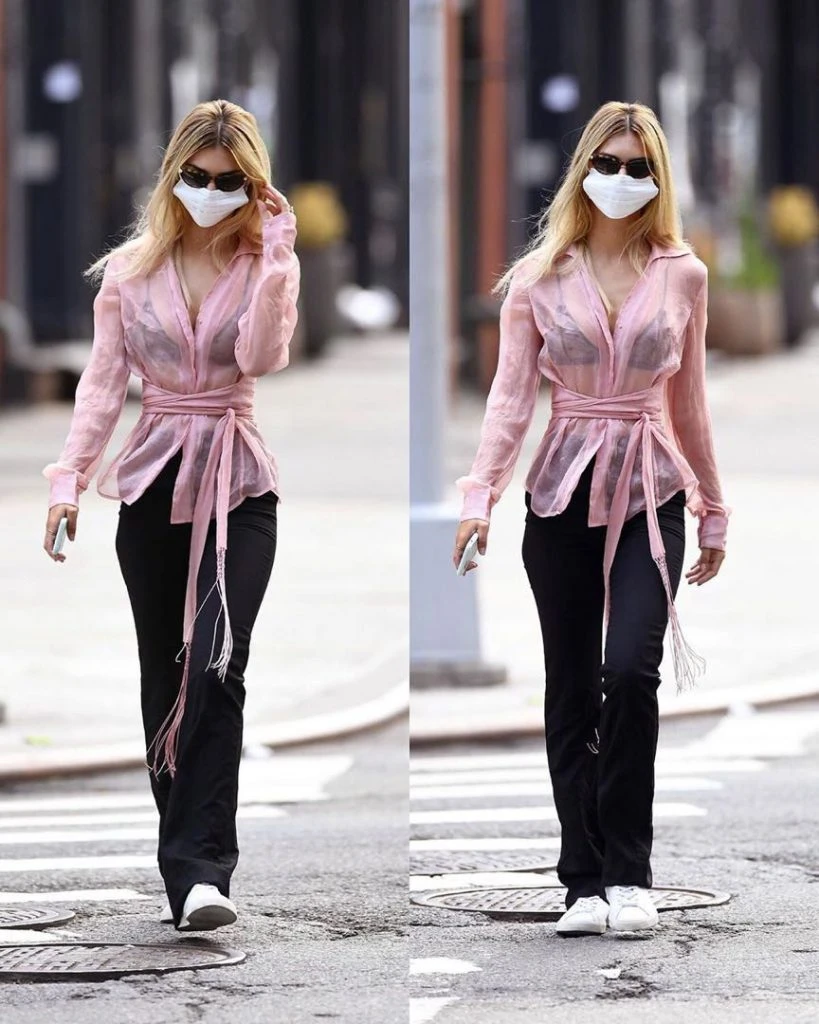 Uno de los looks más llamativos de la semana fue el protagonizado por una blusa de gasa rosa. Súper transparente y con lazo en la cintura, la prenda dejaba ver un corpiño negro de encaje.