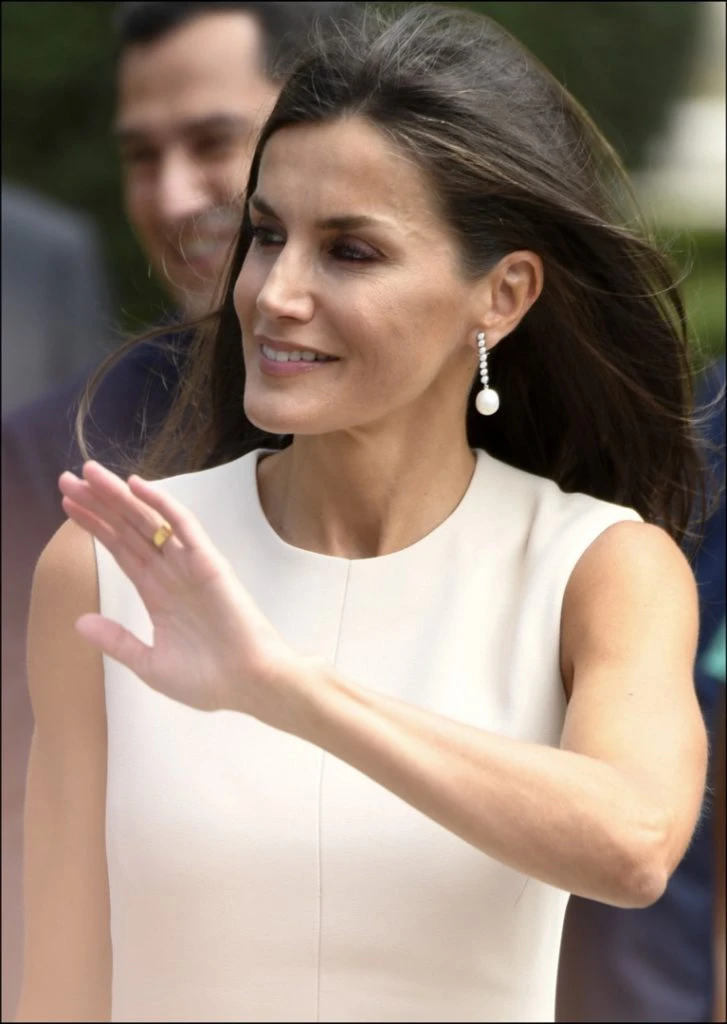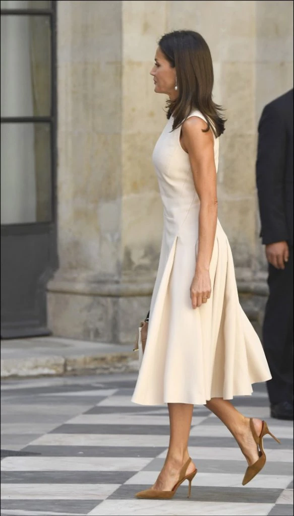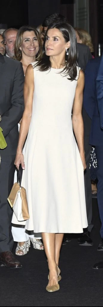 Así lo vimos en un acto en Sevilla con un look elegante aunque repetido (bien por ella). Se trata del vestido color crudo de Pedro del Hierro, con escote redondo cerrado, sin mangas y con falda de vuelo con plisado en los laterales que ya lo había llevado en el mes de marzo del año pasado, durante su visita a nuestro país.
