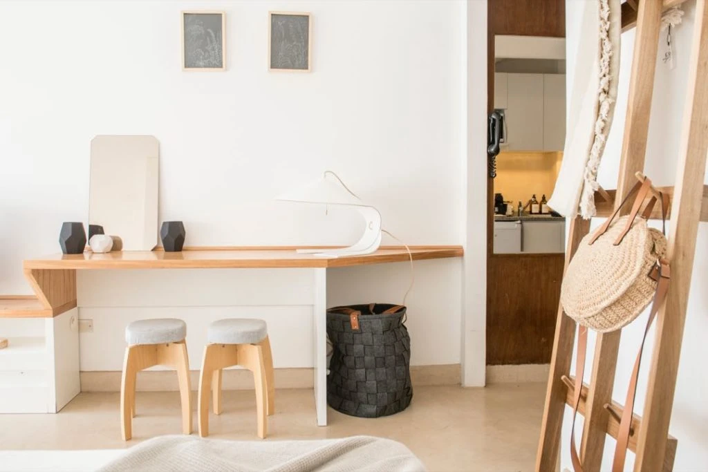 Las claves de este mini depto: accesorios para guardar, colgar y decorar, con calidez y funcionalidad. Y el aprovechamiento del balcón que ilumina todo el ambiente e incorpora un nuevo espacio exterior.