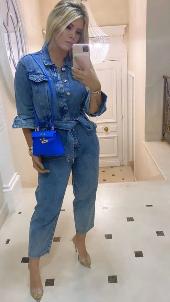 Wanda Nara subió a sus redes sociales una foto con un look de un overol de jean, adelanto de la próxima temporada, de la firma H & M.