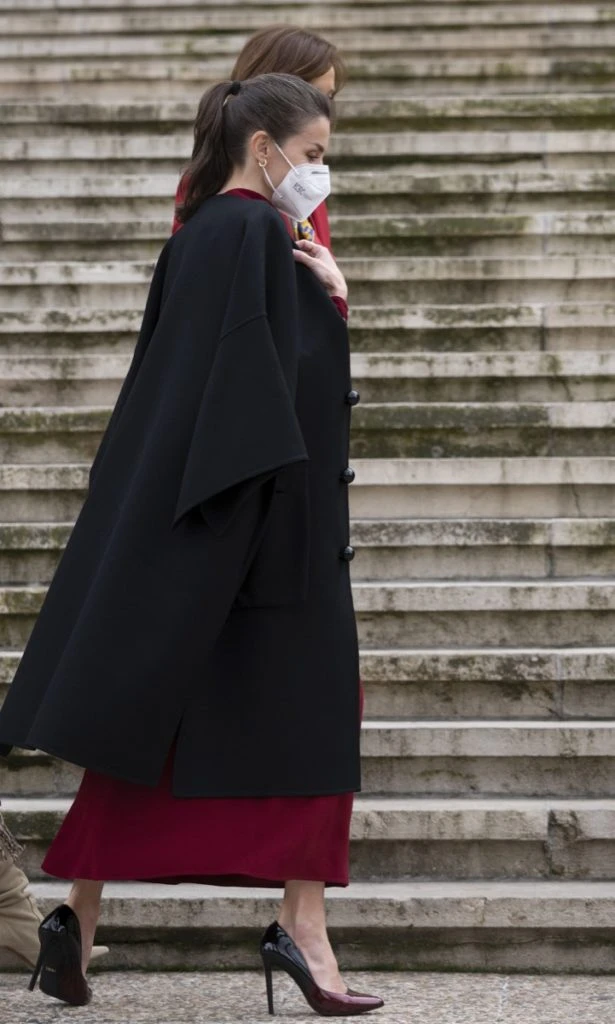 La reina Letizia complementó su look con un abrigo color negro de corte net by Carolina Herrera, una de sus marcas favoritas uq ellevó sobre sus hombros, un detalle súper chic.