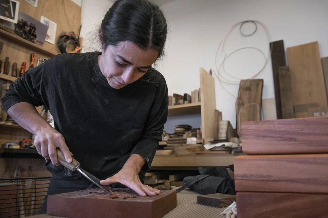 Retrato -en fotos y video- de Loli Mallea, la mujer al frente de Sur del Cruz, una usina de carpintería artesanal. Trabaja la madera de forma analógica y combina arte, oficio y arquitectura.