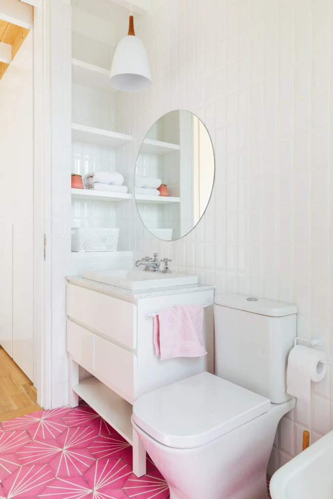 Esta tendencia apunta a jugar con paredes, pisos y muebles en distintos tonos de un mismo color, para darle una impronta auténtica a tu baño. El color que se viene: el rosa. El universo es enorme: paredes, empapelados, decoración (como jarrones o flores), cortinas.