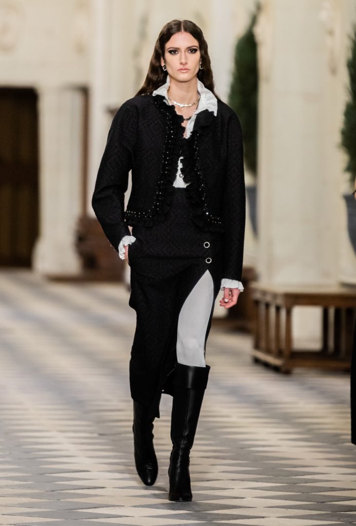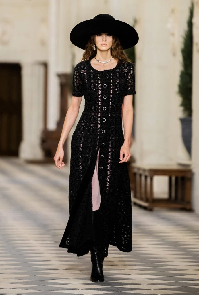La habilidad de los artesanos se luce en un vestido largo de encaje negro compuesto por celosías salpicadas de tachuelas, realizado por Lemarié; la parte superior de un vestido de damasco bordado íntegramente por Lesage; las sandalias con plataforma plateada brillante bicolor y las botas negras cónicas con puños doblados y tacones altos de Massaro. Y hay un gran sombrero negro de Maison Michel, para un look muy Milady.