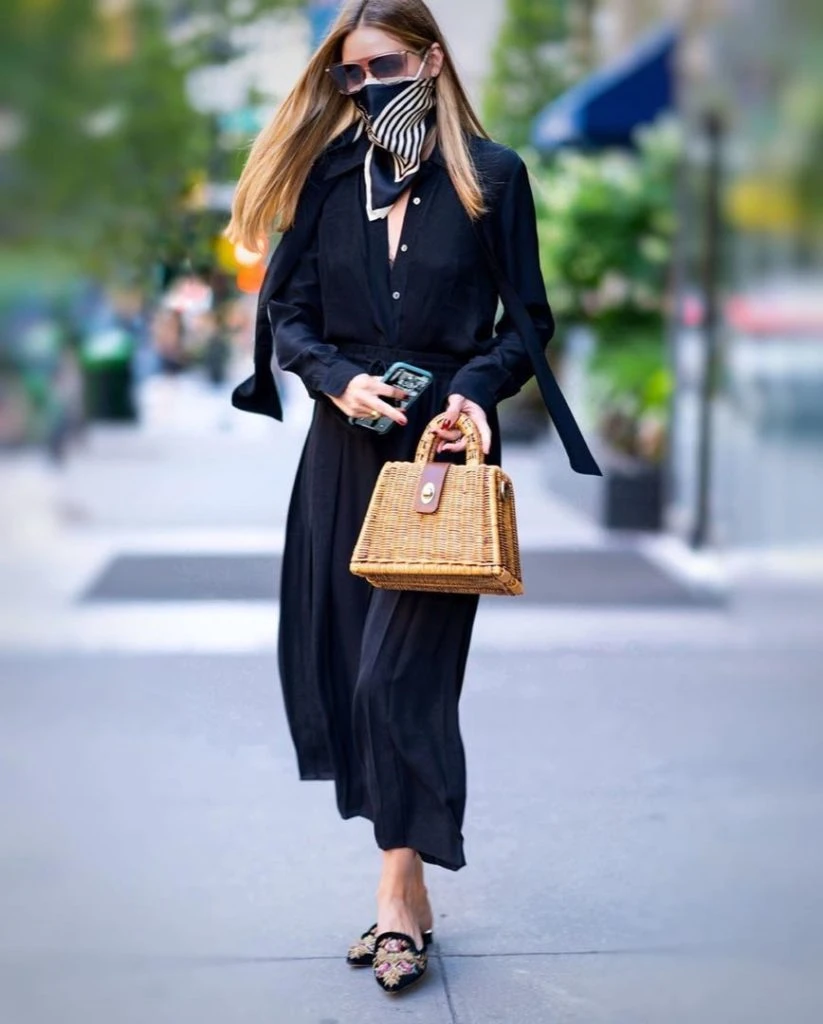 El vestido camisero de largo midi fue el preferido de Meghan Markle en la primavera, y también lo eligió Olivia Palermo. Por cómodo y versátil, es la prenda que no te debería faltar del placard. Y si es negro, se convierte en un básico indispensable para armar un buen look. Ella le agregó una mini bag de mimbre, el toque chic, y sus mules bordadas.