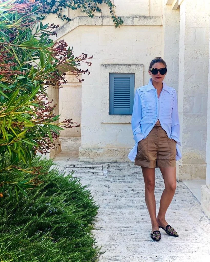 Este combo es perfecto para un working look súper canchero. Ella lo armó con una camisa casi tan larga como el bermudas y le sumó mules, sus zapatos preferidos.