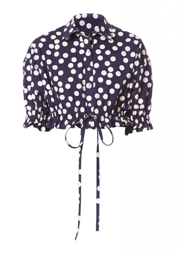 Vestidos y blusas se llenan de estos polka dots en blanco con fondo azul marino.