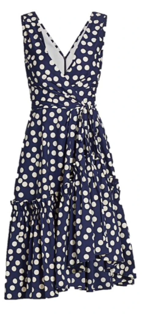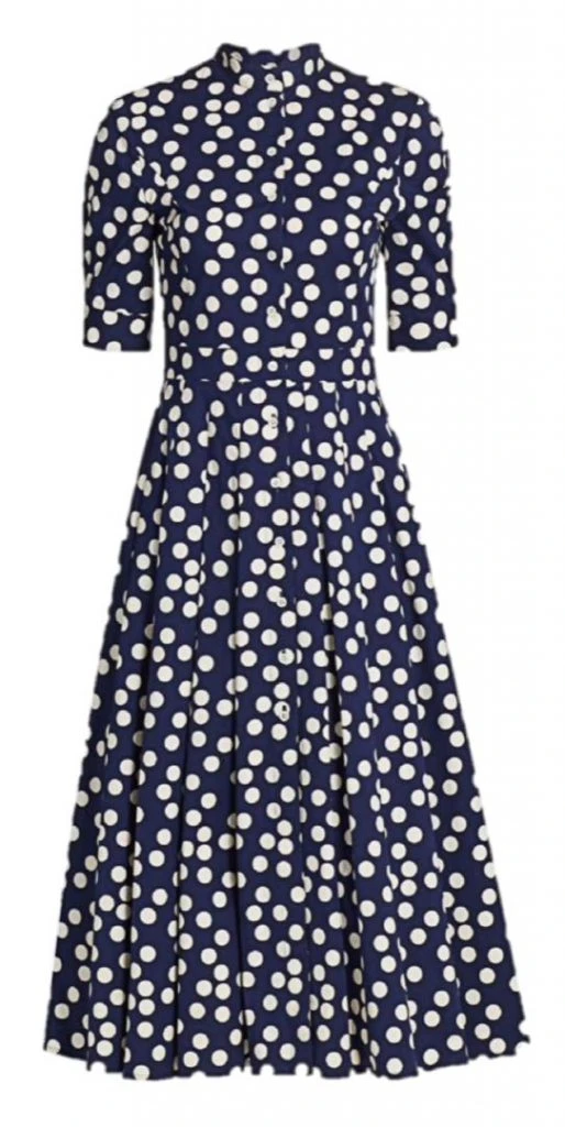 El icónico estampado gráfico Herrera de lunares se re-imagina para esta ocasión a más pequeña escala y con un giro más femenino en blanco y azul marino.