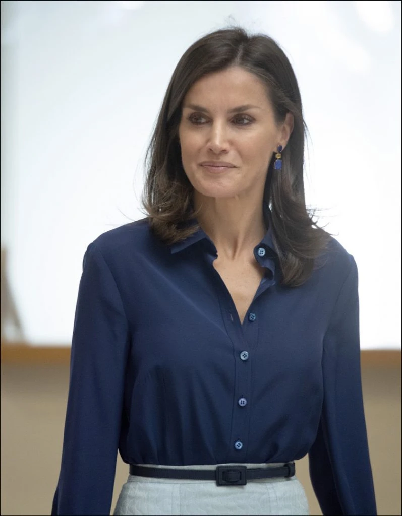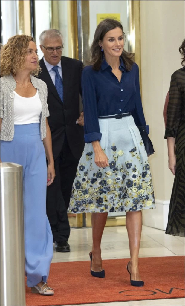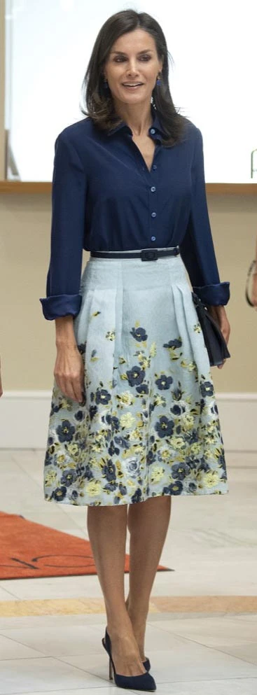 Es que este es un look muy acertado para la agenda de una reina. Consiste en una camisa en azul marino en tafeta (la Reina suele arremangarla ) y falda midi silueta A, en seda, con tablas y bordado con motivos florales en distintos tonos verdes y azules. Lo completó con cinturón para entallar su silueta.