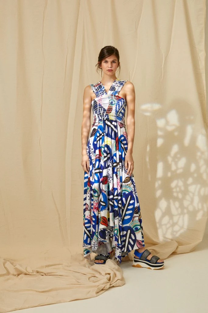 El vestido es de la marca Justa Petra, es de ruedo irregular y tiene una estampa con motivos africanos. Tiene un largo perfecto para que uses con tacos, como lo hizo Catherine, o con sandalias con base de goma, como lo propone la marca.
