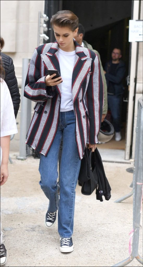 Por eso ella siempre nos sorprende con sus looks. Esta vez, a un simple outfit de remera básica blanca más jean recto y zapatillas Converse, le sumó el ítem que es tendencia esta primavera: el blazer oversize. Tramado, a rayas y con doble abotonadura, el saco levanta este look y le da un toque trendy.