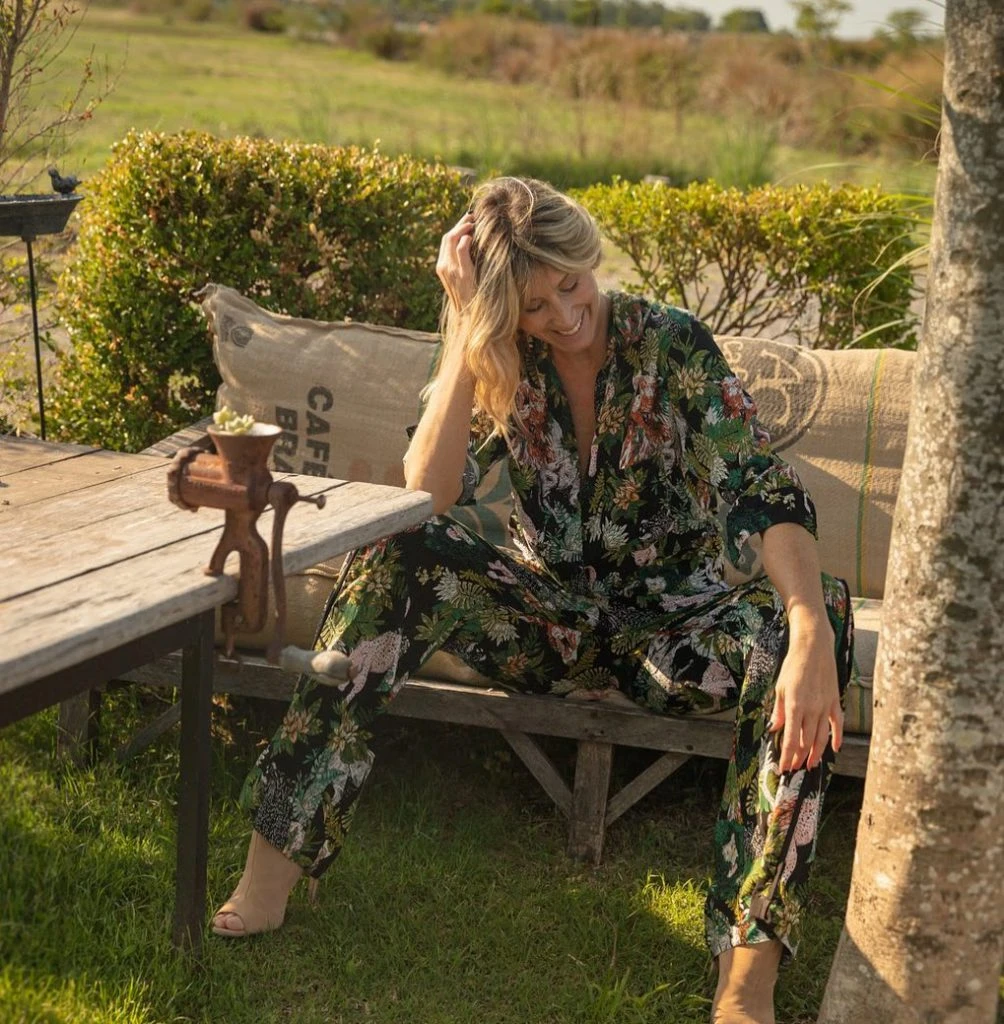Sole Solaro aprovechó el sol del parque para vestirse con un look de estampa tropical ideal para los días más templados del otoño. Se trata de un conjunto de pantalón suelto y camisa, que es súper versátil porque permite hacer diferentes combinaciones.