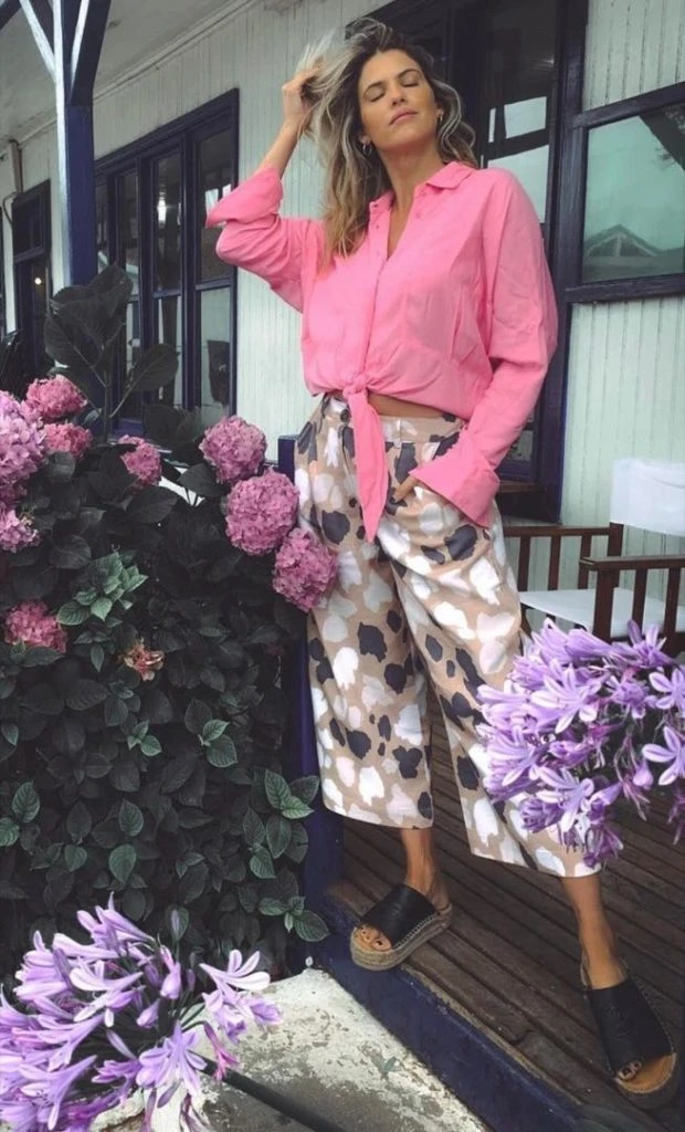 El rosa puede combinarse con blanco, negro y hasta con verde, si te gusta marcar tendencia. También es ideal con un estampado como el que eligió Mery del Cerro para esta camisa rosa chicle.