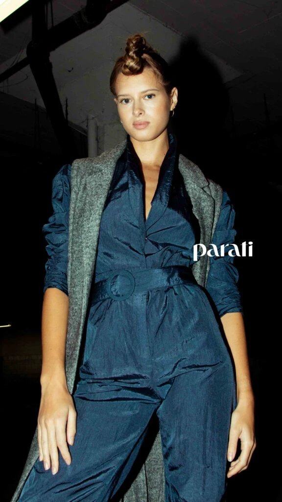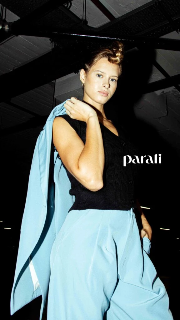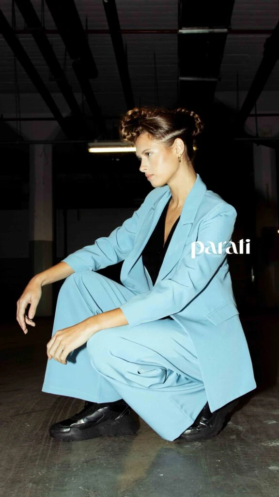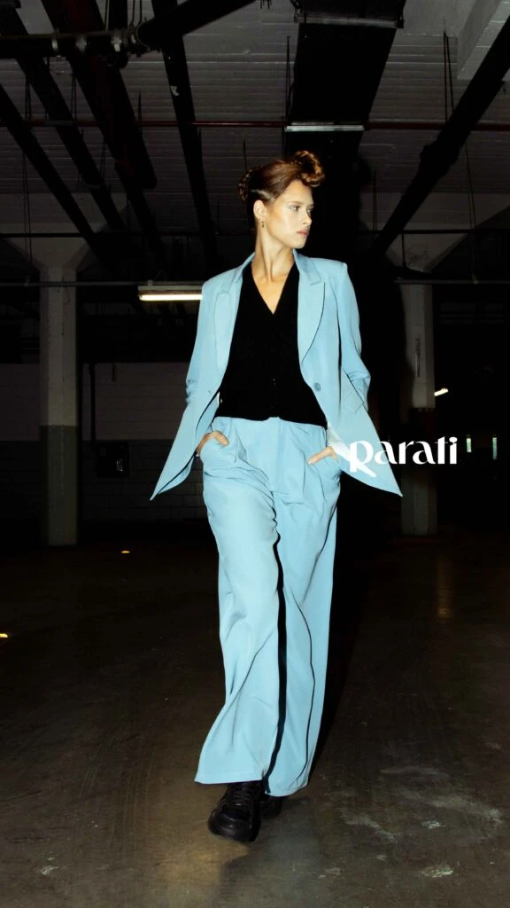 A primera vista lo que llama la atención es el color, un celeste intenso que va a iluminar los días más fríos. En este caso se trata de un traje de saco y pantalón ancho pinzado que es la solución para los días de oficina. Un dúo que se multiplica en muchas opciones según las ocasiones y los estilos.