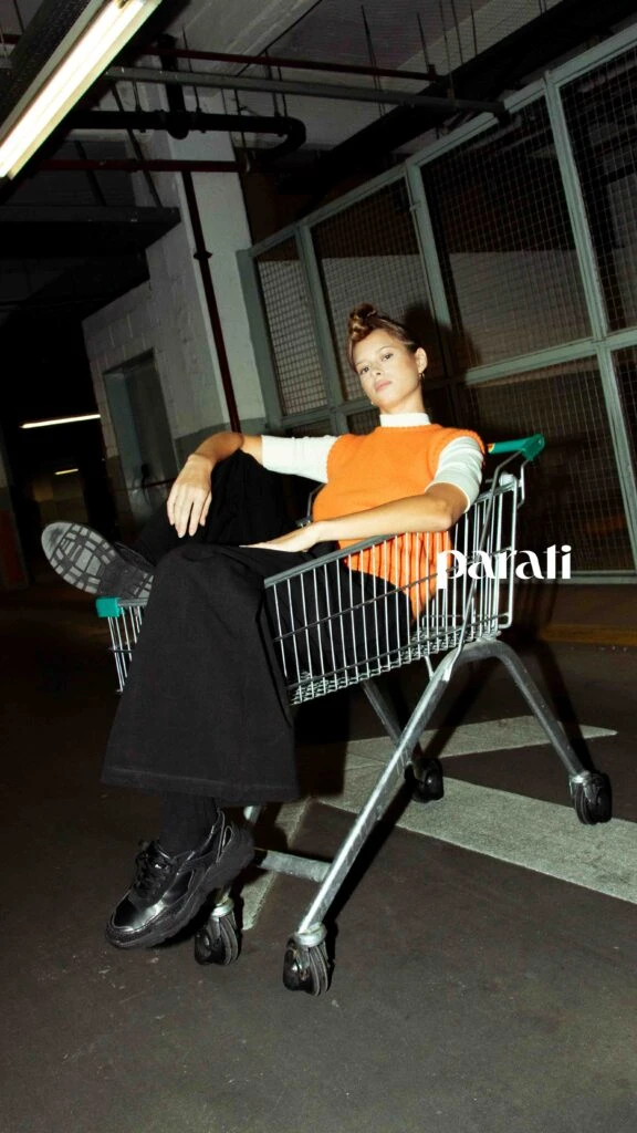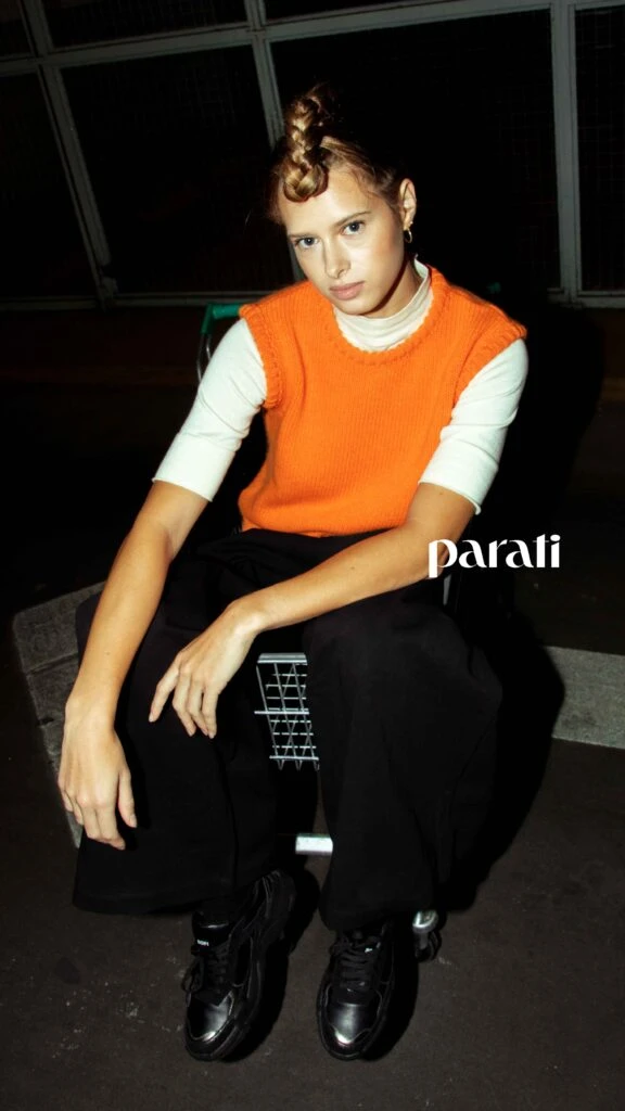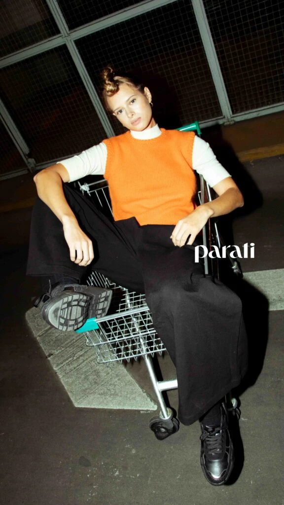 La elegancia del off white en la media polera, el naranja vibrante del chaleco a la cintura y la modernidad del negro en el pantalón baggy con piernas redondeadas que lo hace muy cómodo. Para caminar sin cansancio, las zapatillas vuelven a escena.
