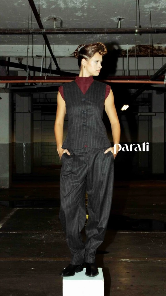 Las dos piezas con orígenes sartoriales se deconstruyen en un chaleco entallado y un pantalón pinzado con el ruedo más angosto que los moderniza. La gabardina de lana rayada recuerda a los clásicos trajes masculinos y ayuda a definir el estilo.
