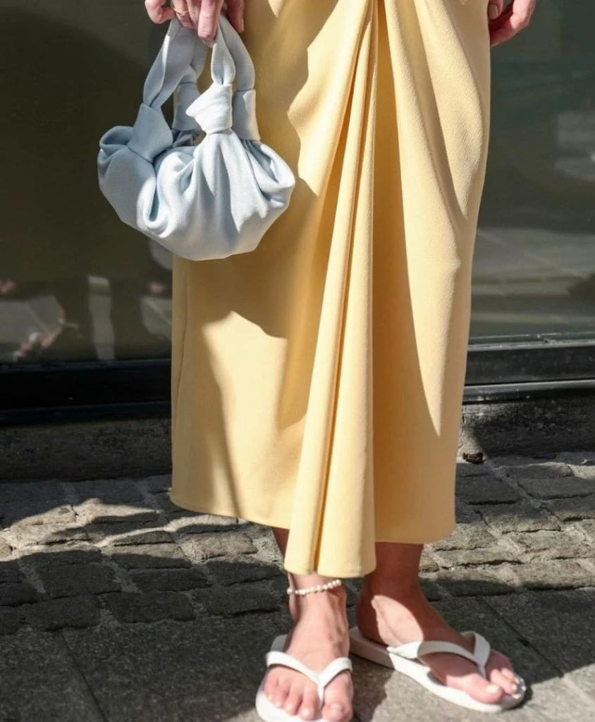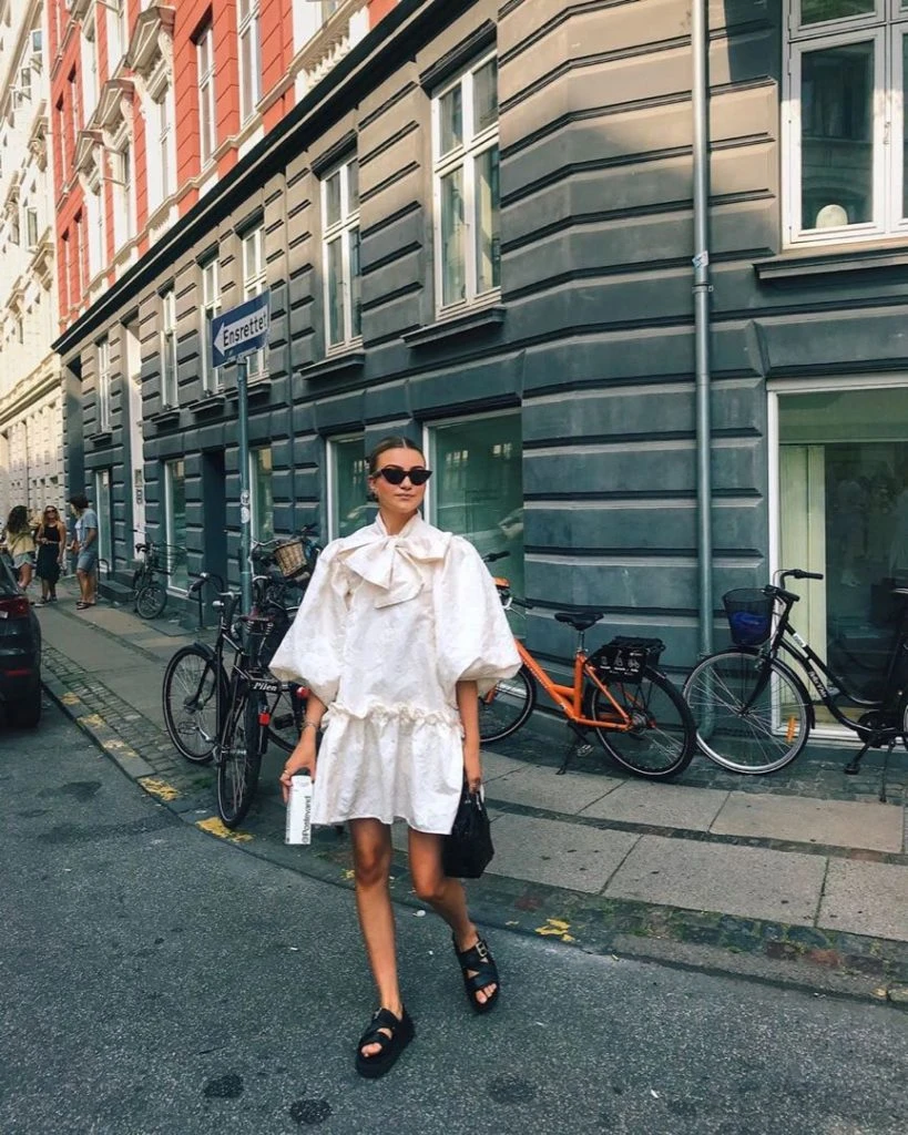 Y siguiendo con el estilo comfy, las sandalias para el próximo verano vienen planas. Así como lo leíste. E incluso, el street style danés llevó espectaculares vestidos y carteras de lujo pero ¡con ojotas!