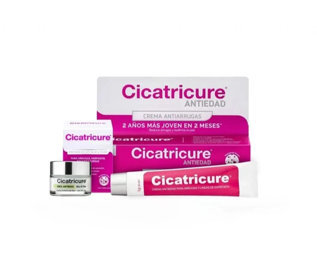 - 3. Estuche Cicatricure Crema Antiedad x 60g+ Contorno de Ojos. Su exclusiva tecnología incorpora Biopeptide Regen, un complejo que promueve la regeneración natural de las células y repara el daño de la piel, logrando que te veas 2 años más joven en 2 meses.