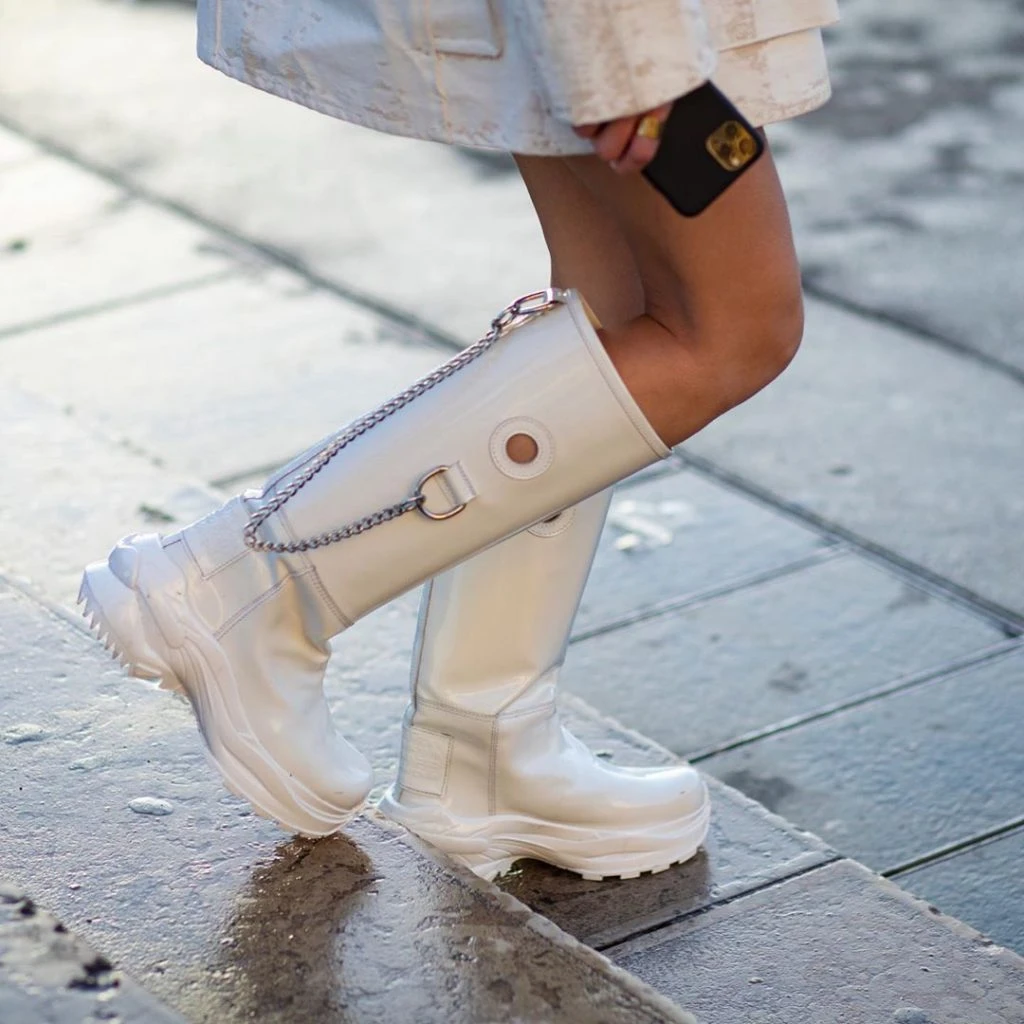 A unas botas de lluvia de color blanco, se le sumó una cadena plateada y un círculo a los laterales. ¿Te animás?