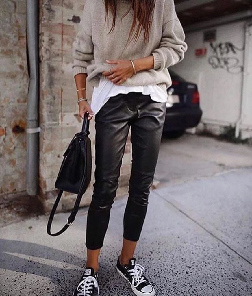 El cuero siempre encuentra su lugar en el guardarropas. Llevalo de día con un suéter y zapatillas, y adoptalo para la noche con una camisa, blazer y tacos.