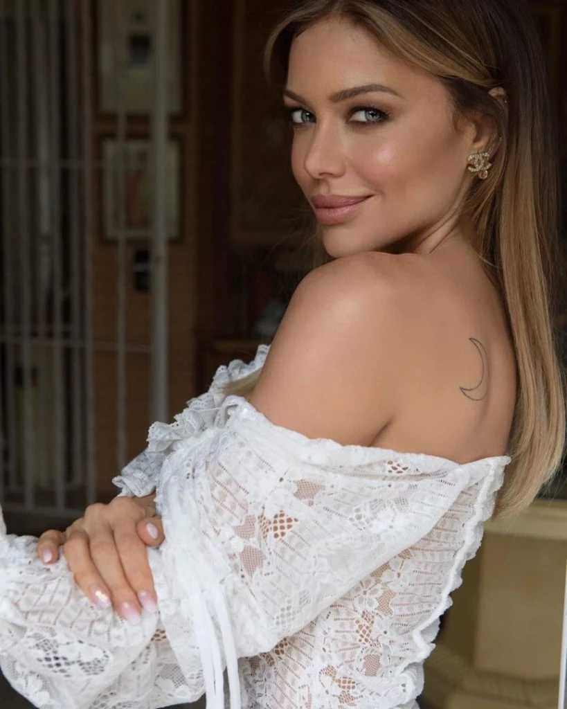 Otra vez encaje, en este caso en nude y en una remera de mangas largas que combinó con un pantalón negro, para darle un toque más actual.