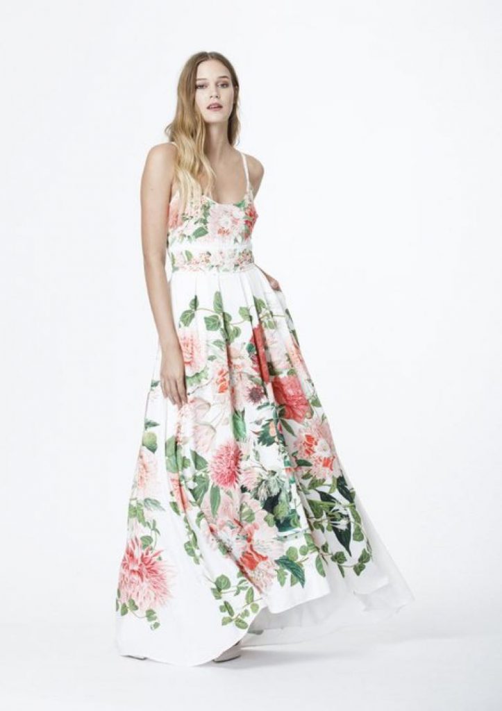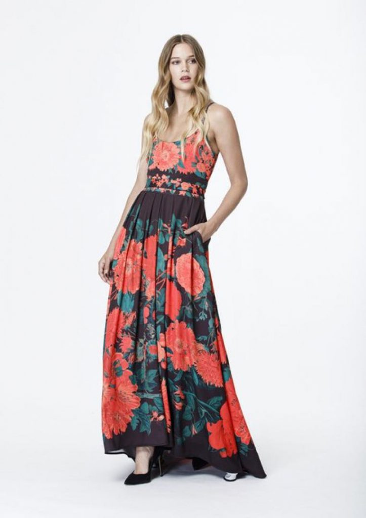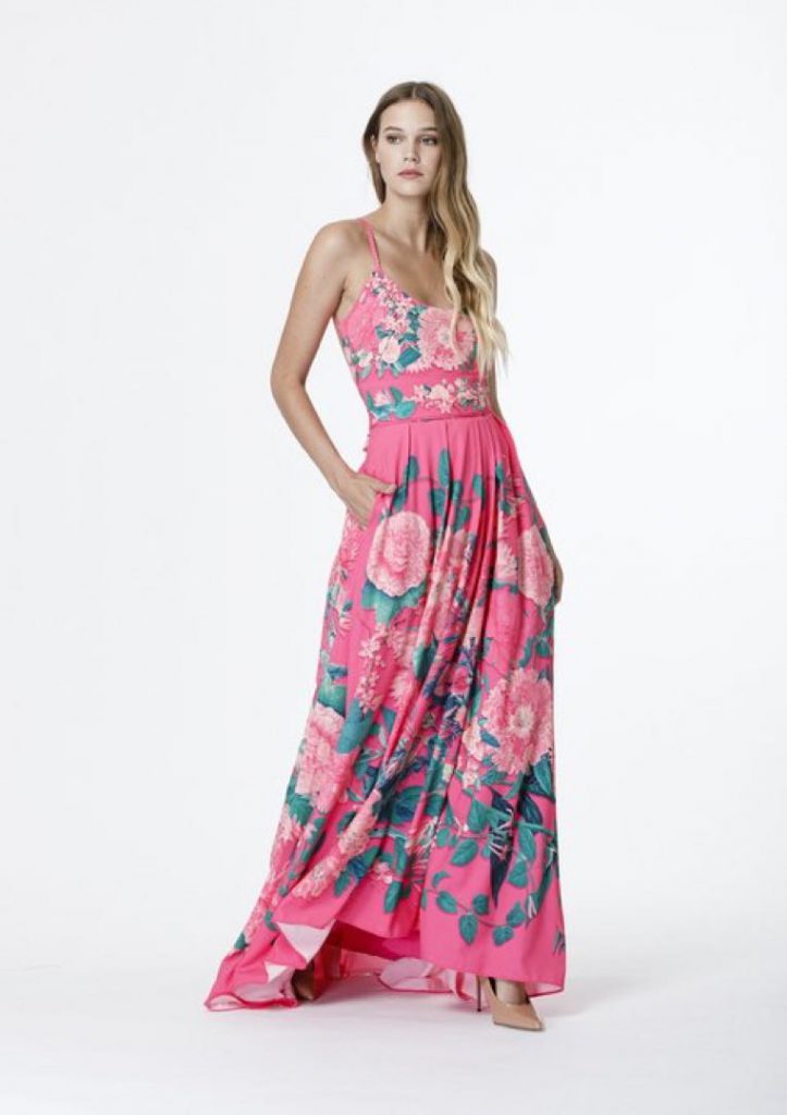 Se trata de un vestido largo de creppe con falda plato tableada y estampa exclusiva floral, breteles finitos y escotado en la espalda. El modelo se llama Vero, es de VL Natalia Antolín y cuesta 49.000 pesos. Fabiola lo llevó en color rosa, pero también está la versión en blanco y en negro. Acompañó el look con el pelo semi recogido con raya al medio y un make up natural.
