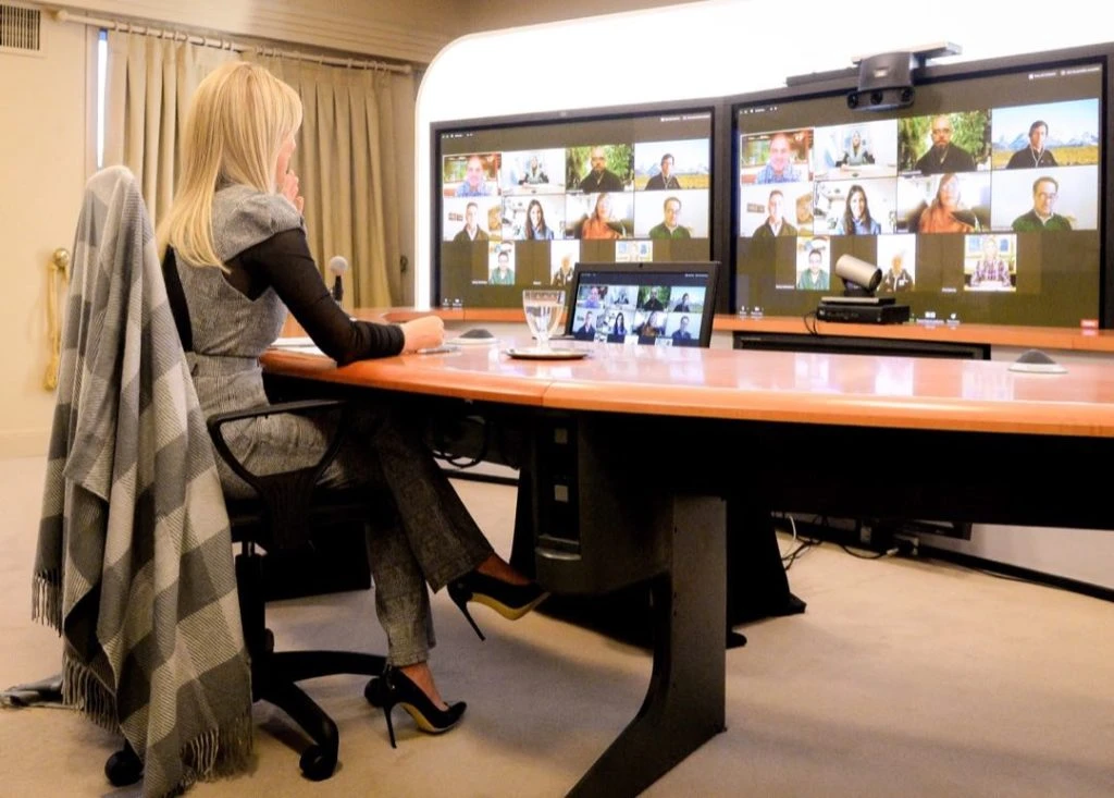 Continuando con su agenda, Fabiola Yáñez se reunió por videoconferencia con representantes de ONGs dedicadas al cuidado y preservación del medio ambiente. Una vez más, ella eligió vestirse con un diseño argentino.