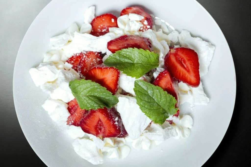 - 4. Luego, romper los discos de merengue en trozos grandes y colocarlos en un vaso para postre. Agregar las frutillas en mitades, cubrir con un poco de crema de leche batida (con esencia de vainilla y azúcar si se quiere o al natural) y terminar con poco de merengue.