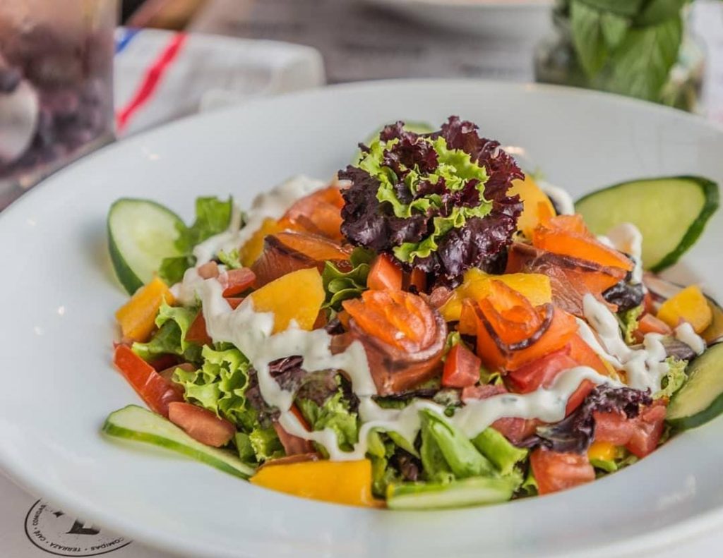 - 5. Colocar todo en una ensaladera, salpimentar a gusto y mezclar. Agregar por encima el salmón gravlax y el aderezo y servir.