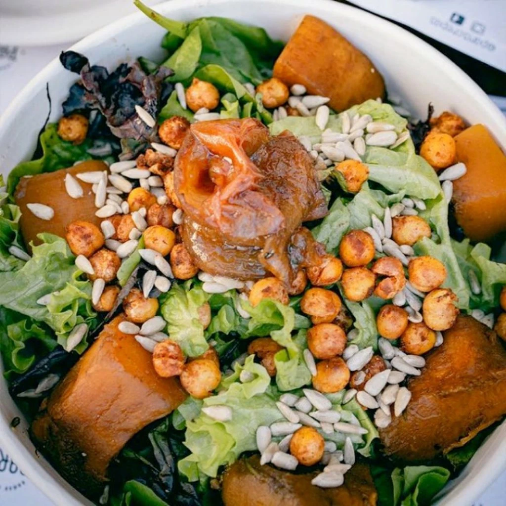 - 4. En una ensaladera o plato hondo, colocar las hojas verdes, luego los cubos de calabaza asados, los garbanzos cocidos y por último los tomates secos. Al momento de servir, terminar con el aderezo y las semillas de girasol previamente tostadas.